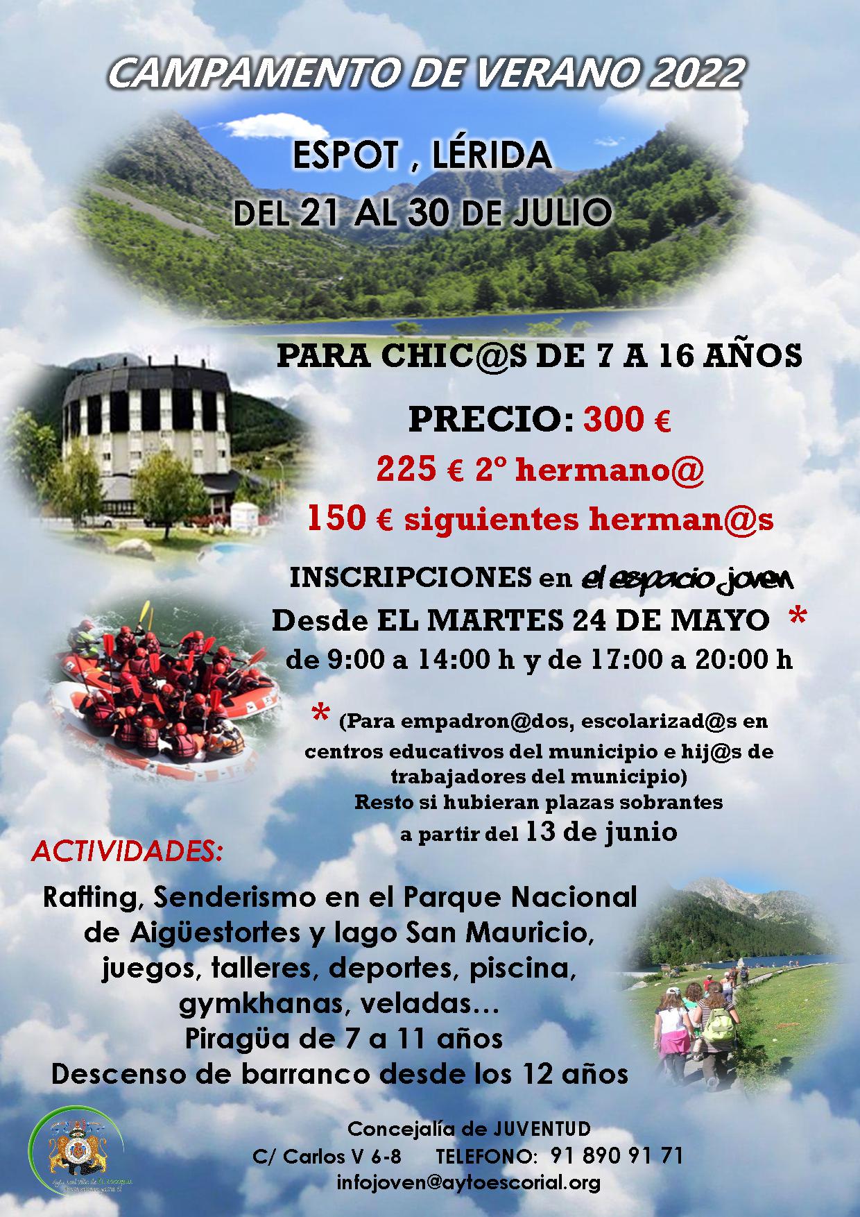 La Concejalía de Juventud del Ayuntamiento de El Escorial abre este martes 24 de mayo el periodo de inscripción para participar en el campamento de verano dirigido a niños y niñas de 7 a 16 empadronados, escolarizados en el municipio o cuyos padres sean trabajadores del mismo (se deberá acreditar el 2º y el 3º casos). El campamento se desarrollará en Espot (Lérida) del 21 al 30 de julio.