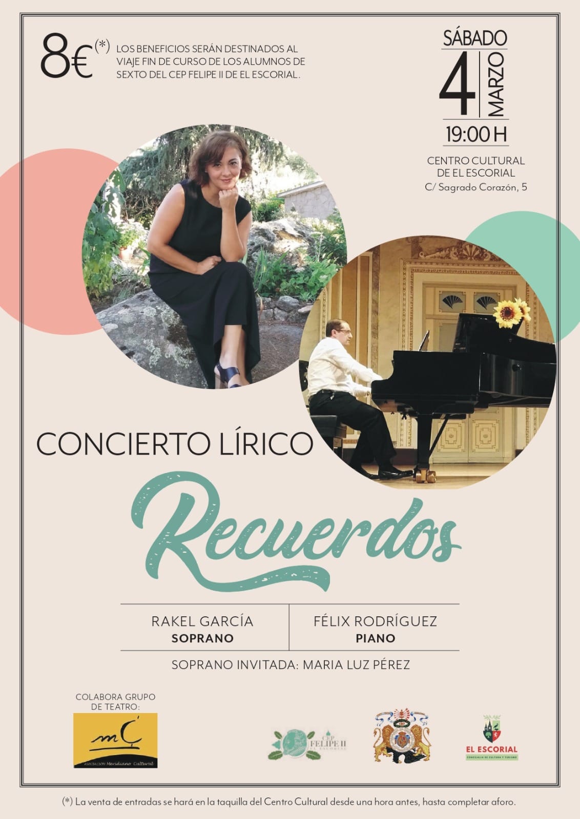 El Centro Cultural de El Escorial acoge este sábado, 4 de marzo (19:00 horas), el concierto lírico «Recuerdos», a cargo de Rakel García (soprano) y Félix Rodríguez (piano). Además, contarán con María Luz Pérez como soprano invitada.