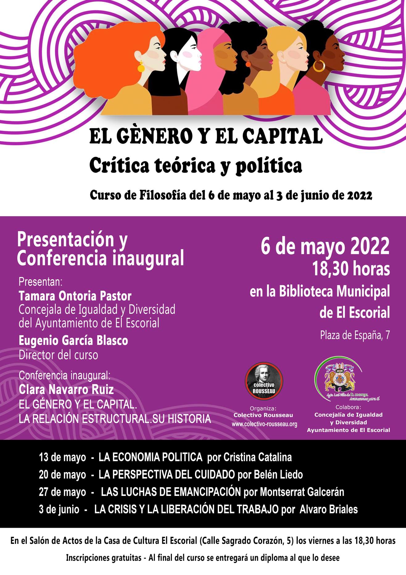 El Colectivo Rousseau organiza en El Escorial el curso «El género y el capital, crítica teórica y política», que tendrá lugar del 6 de mayo al 3 de junio en la Biblioteca Municipal. La conferencia inaugural, el 6 de mayo (18:30h), contará con la presencia de Clara Navarro Ruiz, centrándose en «La relación estructural». Además, intervendrán el director del curso, Eugenio García Blasco, y la concejala escurialense de Igualdad y Diversidad, Tamara Ontoria.