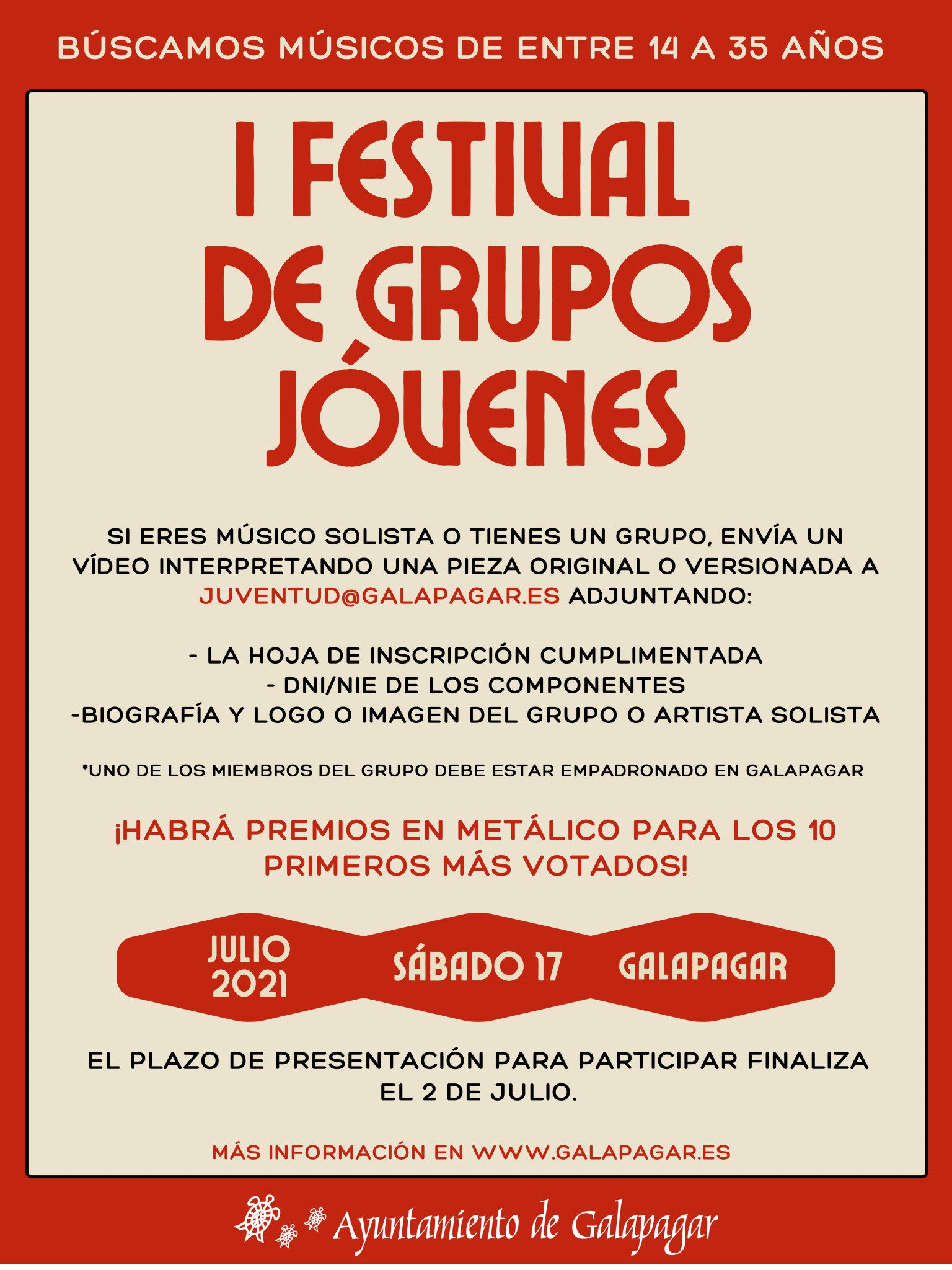 La Concejalía de Juventud, junto al trabajo participativo desarrollado por los grupos jóvenes de Galapagar, ha organizado el I Festival de Grupos Jóvenes, que está previsto que se celebre el sábado 17 de julio y donde se elegirán los tres finalistas que tocarán como teloneros, junto a un grupo profesional elegido por los propios jóvenes, en un segundo concierto programado para el 13 de septiembre, en el marco de las fiestas patronales.