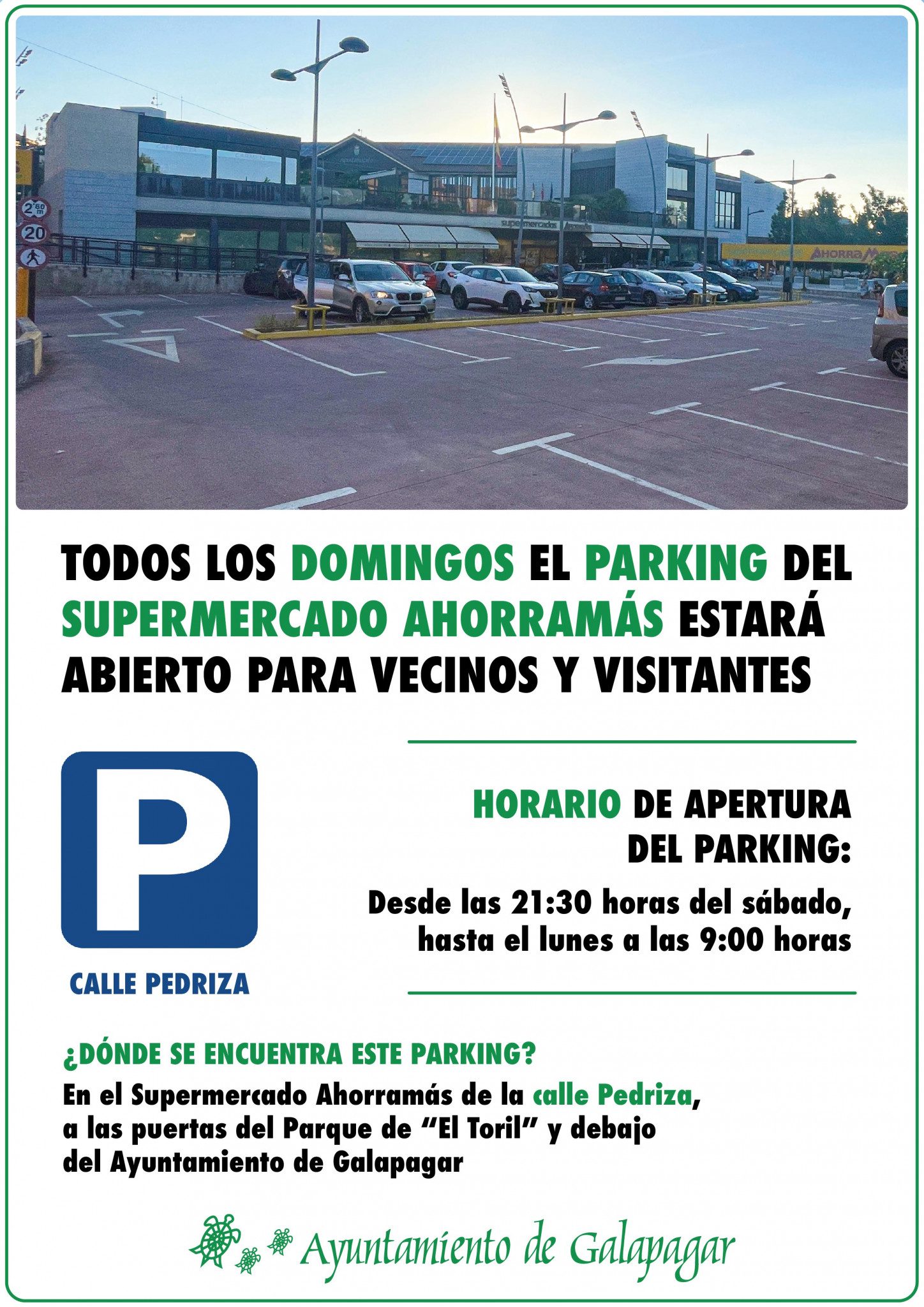 Con el objetivo de facilitar el acceso al casco urbano, el Ayuntamiento de Galapagar ha llegado a un acuerdo con la cadena de supermercados AhorraMás para que, a partir de ahora, todos los vecinos puedan hacer uso, todos los domingos, del parking del AhorraMás de la calle Pedriza, junto al Ayuntamiento.