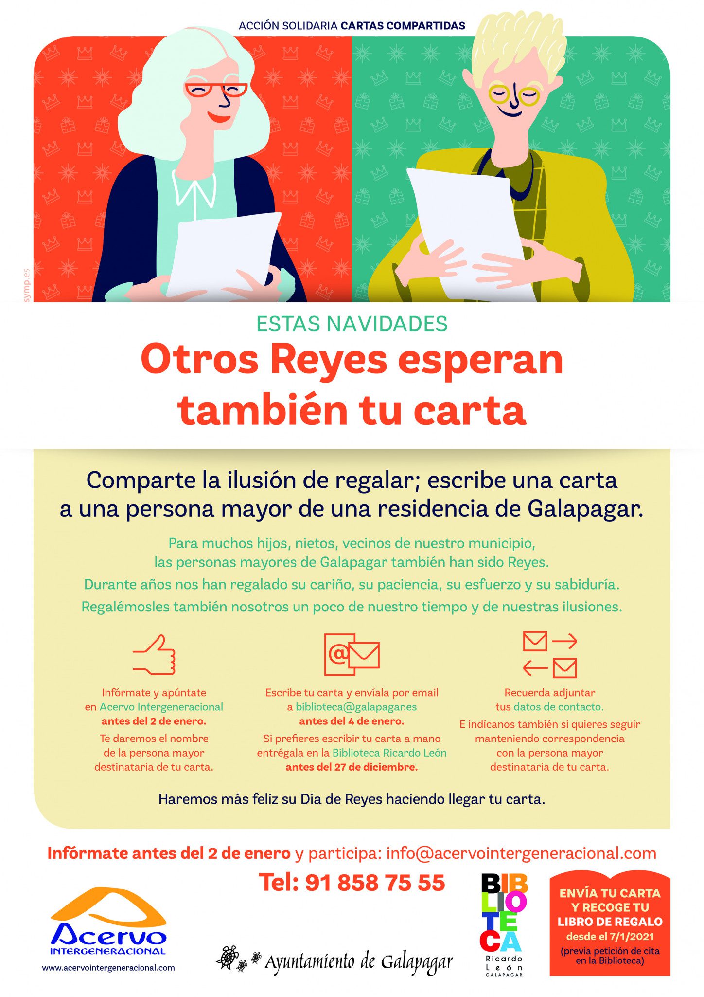 La Biblioteca Municipal Ricardo León, en colaboración con la ONG Acervo Intergeneracional, ha organizado la actividad “Otros Reyes esperan también tu carta”, para hacer llegar, mediante correo electrónico, una serie de cartas a los mayores de las residencias del municipio. Para muchos hijos, nietos y vecinos de Galapagar, las personas mayores también han sido reyes, “ya que durante años nos han regalado su cariño, su paciencia, su esfuerzo y, por supuesto, su sabiduría”. De esta forma, la Biblioteca Ricardo León quiere animar a todos los vecinos a regalar a los mayores tan solo un poco de nuestro tiempo y de nuestras ilusiones.