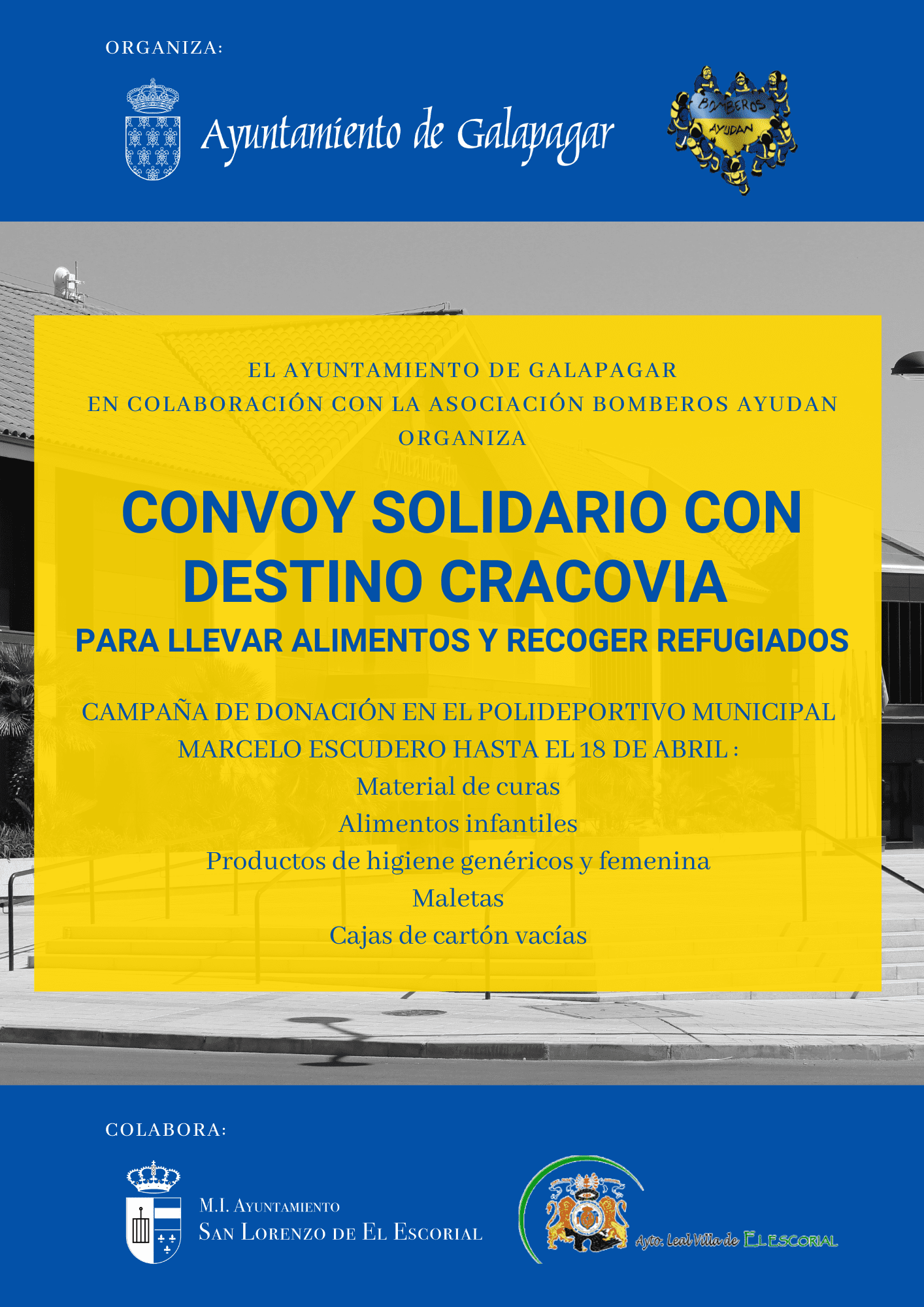 El Ayuntamiento de Galapagar ha organizado junto a la asociación Bomberos Ayudan un convoy con destino a Cracovia para llevar alimentos y material sanitario y recoger a personas refugiadas de Ucrania. La concejala de Seguridad Ciudadana, Mercedes Nuño Masip, contactó con la asociación Bomberos Ayudan al conocer su gran labor en la gestión de ayuda humanitaria en Ucrania, ofreciendo la ayuda del Ayuntamiento de Galapagar en la próxima misión que tuvieran pensada.