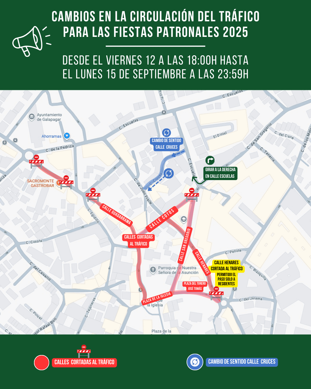 Con motivo de la celebración de las Fiestas Patronales y con el objetivo de mejorar la movilidad peatonal y garantizar la seguridad en los días de mayor afluencia, el Ayuntamiento de Galapagar ha establecido una serie de medidas extraordinarias en materia de tráfico.