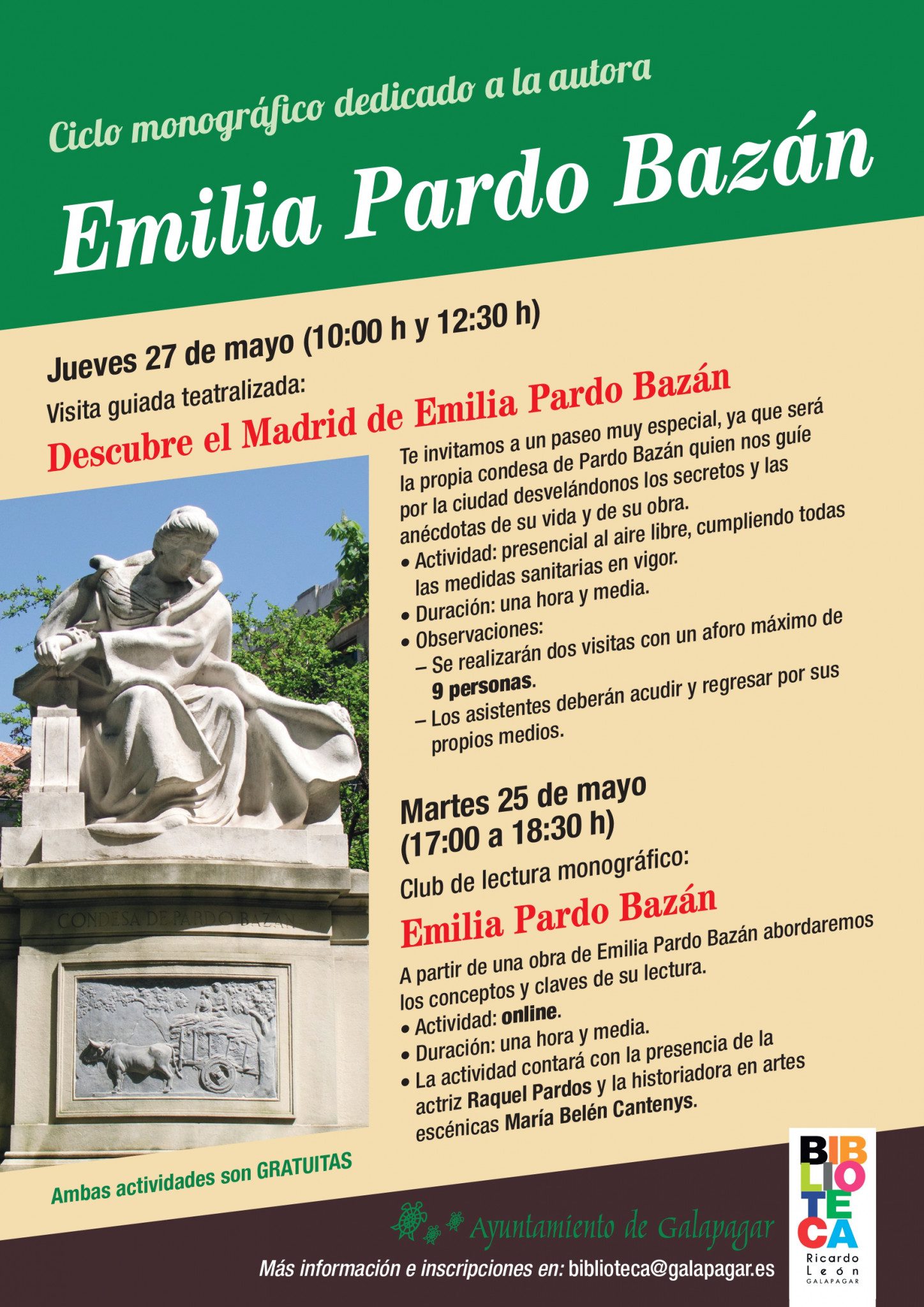 La Biblioteca Municipal Ricardo León de Galapagar organiza un ciclo monográfico dedicado a la autora Emilia Pardo Bazán con motivo del centenario de su fallecimiento. Emilia Pardo Bazán fue una noble y novelista, periodista, ensayista, crítica literaria, poetisa, dramaturga, traductora, editora, catedrática y conferenciante española introductora del naturalismo en España. Además, reivindicó la instrucción de las mujeres como algo fundamental, convirtiéndose en una precursora en sus ideas acerca de los derechos de las mujeres y el feminismo. En su honor, se han organizado las siguientes actividades con el objetivo de conocer mejor su obra: