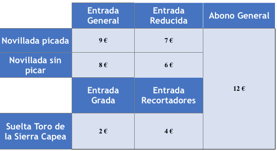 Como es habitual, se ponen ya a la venta los abonos que, por 12 euros, permitirá asistir tanto a la novillada con picadores, como la de sin picadores y la suelta del Toro de la Sierra. Abonos que ya se pueden adquirir de lunes a domingo en la conserjería del Polideportivo (la compra se podrá realizar únicamente con tarjeta). Las entradas individuales se pondrán a la venta directamente en la taquilla de la plaza de toros.