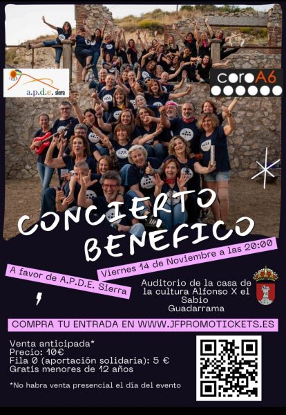 Las entradas, a un precio de 10 euros (menores de 12 años, gratis), ya se pueden adquirir a través del siguiente enlace: https://jfpromotickets.es/es/events/concierto-benefico-coro-a6-a-favor-de-apde-sierra. No habrá venta presencial el día del evento.