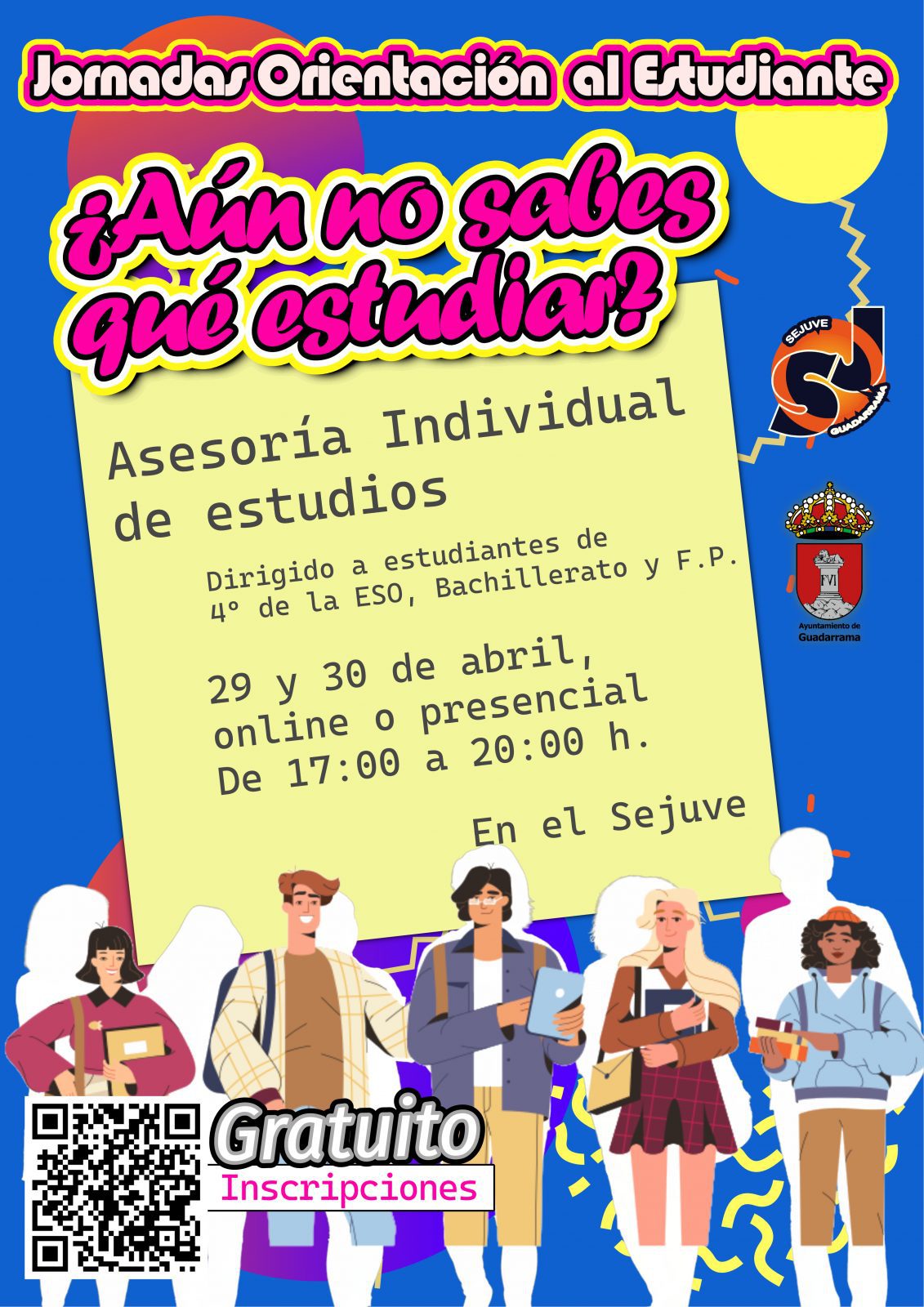 Para ello los jóvenes interesados contarán con sesiones de asesorías individualizadas de 17:00 a 20:00 horas los días 29 y 30 de abril de 2026. Una acción dirigida a estudiantes de 4º de ESO, Bachillerato y FP. Lo interesados podrán solicitar sus sesiones a través del formulario que el servicio de Juventud de Guadarrama ha diseñado para ello. Puede accederse en el enlace: https://form.jotform.com/260712609427053