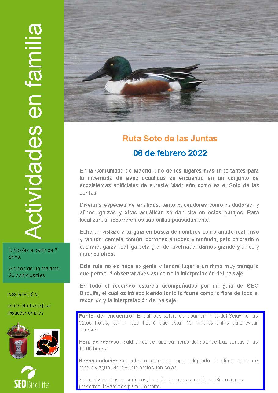 Se trata de una iniciativa que tiene como objetivo que los más pequeños, acompañados por los mayores de su familia que lo deseen, conozcan las diversas especies de anátidas, tanto buceadoras como nadadoras, y otras aves acuáticas que suelen habitar en estos parajes. El recorrido permitirá la correcta observación de las aves de forma tranquila, así como la interpretación del pasaje a través de los conocimientos de un guía experto de SEO Birdlife.