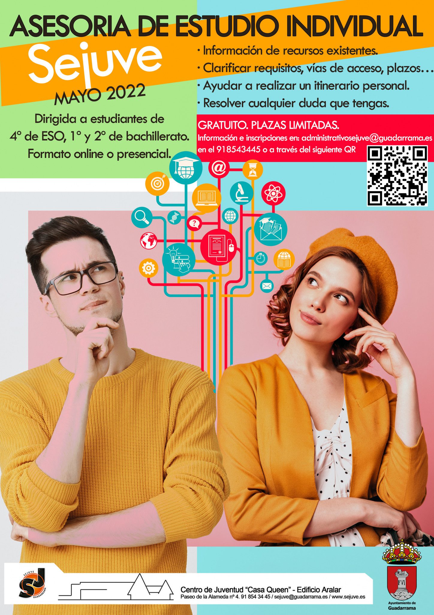 El Servicio de Juventud del Ayuntamiento de Guadarrama (SEJUVE) ofrece a los jóvenes del municipio un nuevo servicio de asesoría de estudio individual, con el que los alumnos de 4º de ESO, Formación Profesional y los de 1º y 2º de Bachillerato pueden trabajar para descubrir o mejorar sus opciones, conociendo todas las posibilidades a su alcance a través de la orientación y el conocimiento de los recursos.