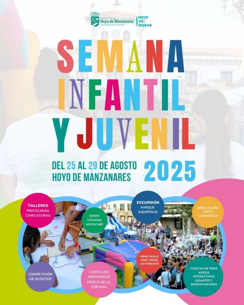 Del 25 al 29 de agosto, Hoyo de Manzanares celebrará una nueva edición de la Semana Infantil y Juvenil con una programación variada y gratuita dirigida a niños y jóvenes. Talleres artesanales, pintacaras, juegos tradicionales, espectáculos de magia, castillos hinchables, fiesta de la espuma, excursiones al parque Aquópolis, concurso de show cooking guiado y competiciones de scooter, entre otras, llenarán de vida esta localidad antes de dar paso a las fiestas patronales. Una semana pensada para disfrutar en familia y con amigos, y despedir el verano por todo lo alto.