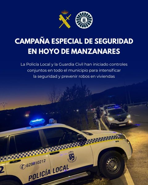 La Policía Local de Hoyo de Manzanares, en colaboración con la Guardia Civil, ha puesto en marcha una campaña especial de dispositivos de seguridad que se llevará a cabo en distintos puntos del municipio.