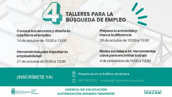 El Ayuntamiento de Hoyo de Manzanares, a través del nuevo servicio integral municipal Hoyo Emplea, pone en marcha un itinerario de cuatro talleres gratuitos dirigidos a mejorar las competencias de las personas en búsqueda activa de empleo.