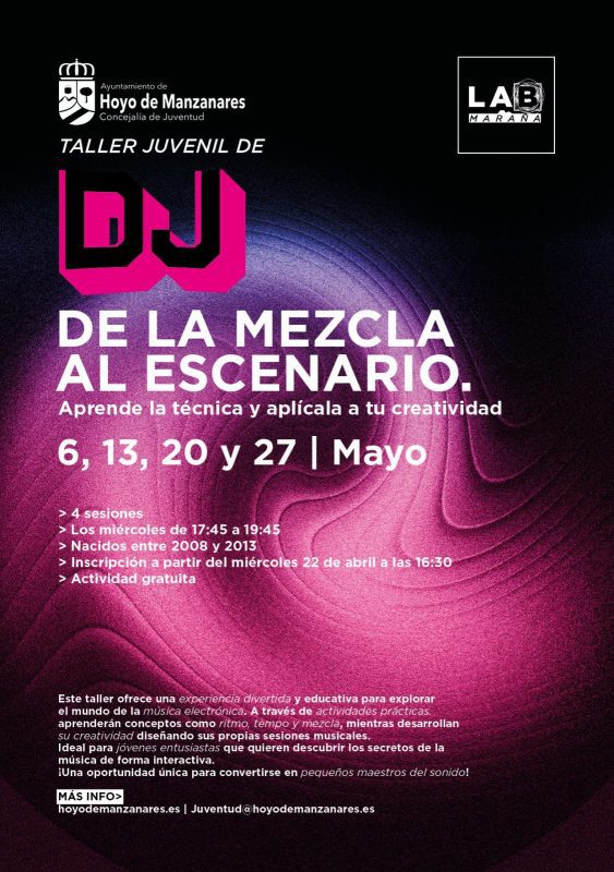 Los días 6, 13, 20 y 27 de mayo, el Ayuntamiento de Hoyo de Manzanares, a través de la Concejalía de Infancia y Juventud y en colaboración con la Asociación La Maraña, ofrecerá de manera gratuita el taller “DJ: De la Mezcla al Escenario”, una actividad gratuita dirigida a jóvenes nacidos entre 2008 y 2013 (ambos incluidos). Una propuesta formativa que combina técnica, creatividad y diversión, donde los participantes aprenderán a mezclar música, entender el ritmo, usar controladoras digitales y preparar un pequeño set como auténticos DJ.