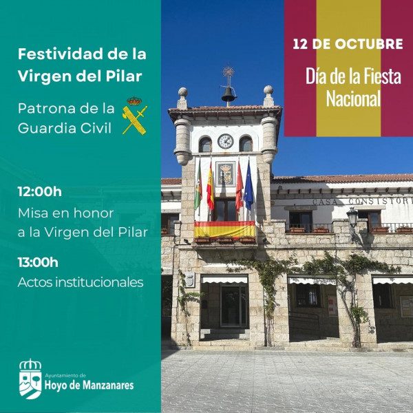 El Ayuntamiento y el Cuartel de la Guardia Civil de Hoyo de Manzanares celebran mañana, sábado 12 de octubre, el Día de la Fiesta Nacional y el Día de la Virgen del Pilar, patrona de la Guardia Civil. Tras la misa, que se celebrará a las 12.00 horas, en la Parroquia de Nuestra señora del Rosario en honor a la Virgen del Pilar, se procederá en la Plaza Mayor a los actos institucionales.