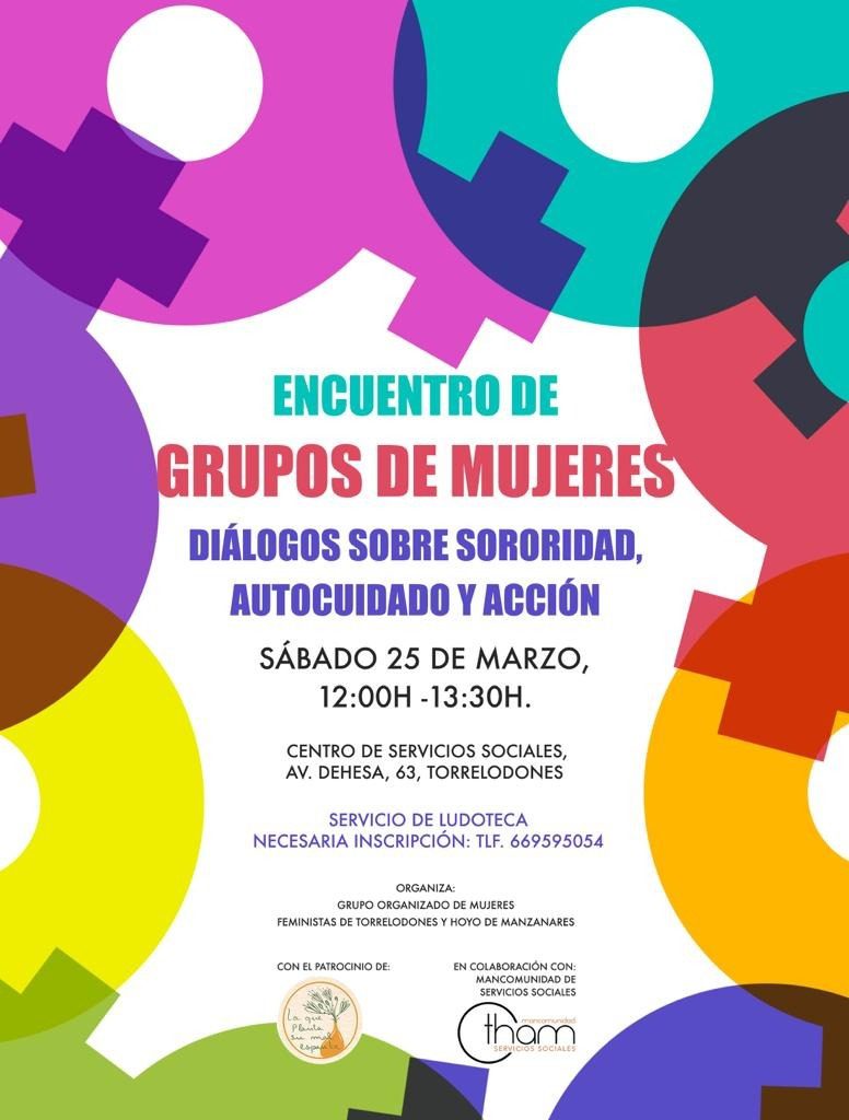 Este sábado, 25 de marzo, a las 12:00h de la mañana, se celebrará el I Encuentro de grupos de mujeres bajo el título «Diálogos de sororidad, autocuidado y acción» en el Centro de Servicios Sociales de Torrelodones de la Mancomunidad THAM.