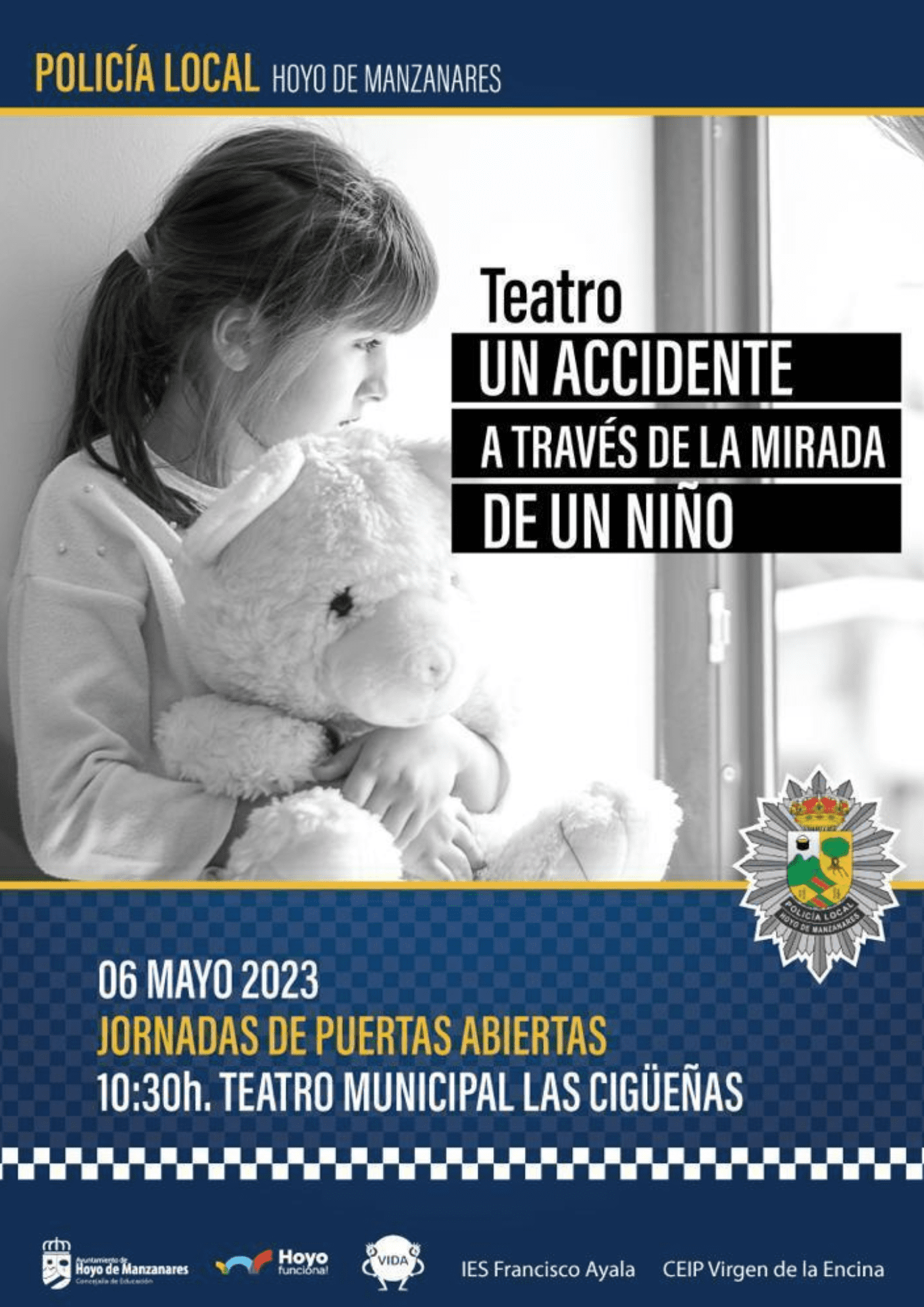 La jornada comenzará a las 10.30h en el Teatro Municipal Las Cigüeñas con la representación: Un accidente a través de la mirada de un niño, con la colaboración del CEIP Virgen de la Encina y el IES Francisco Ayala.