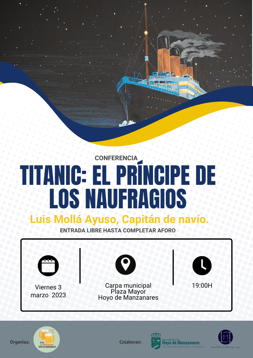 Además, el viernes 3 de marzo, a las 19:00horas, tendrá lugar la conferencia: «Titanic: el príncipe de los naufragios», impartida por el capitán de navío Luis Mollá que nos relatará varios hechos históricos y diferentes anécdotas sobre el transatlántico británico. El mayor barco de pasajeros del mundo al finalizar su construcción, que naufragó en las aguas del océano Atlántico durante la noche del 14 y la madrugada del 15 de abril de 1912, mientras realizaba su viaje inaugural desde Southampton a Nueva York, tras chocar con un iceberg. En el hundimiento murieron 1.496 personas de las 2.208 que iban a bordo, lo que convierte a esta catástrofe en uno de los mayores naufragios de la historia ocurridos en tiempos de paz.