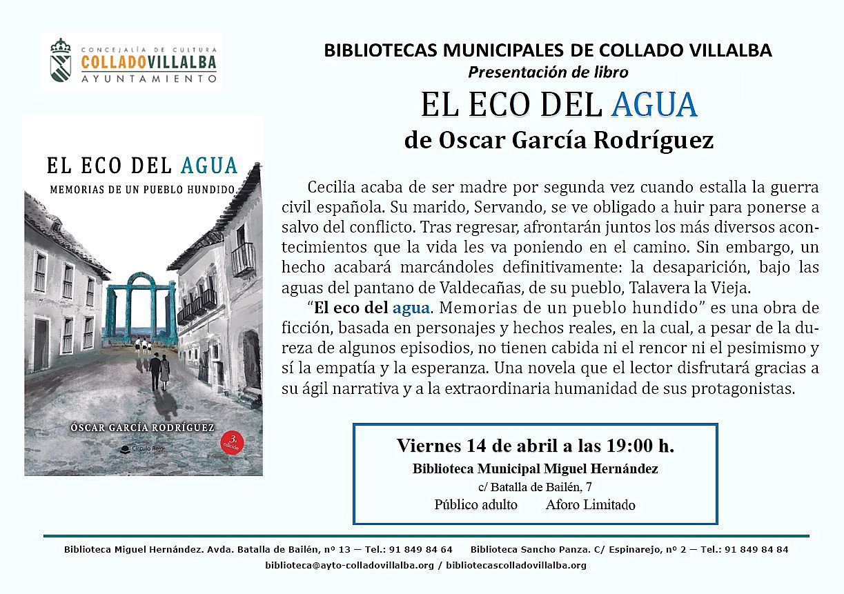 Este viernes, 14 de abril, la Biblioteca Miguel Hernández de Collado Villalba acogerá, a las 19 horas, la presentación de la novela «El eco del agua. Memorias de un pueblo hundido», de Óscar García Rodríguez.