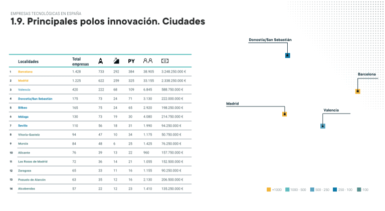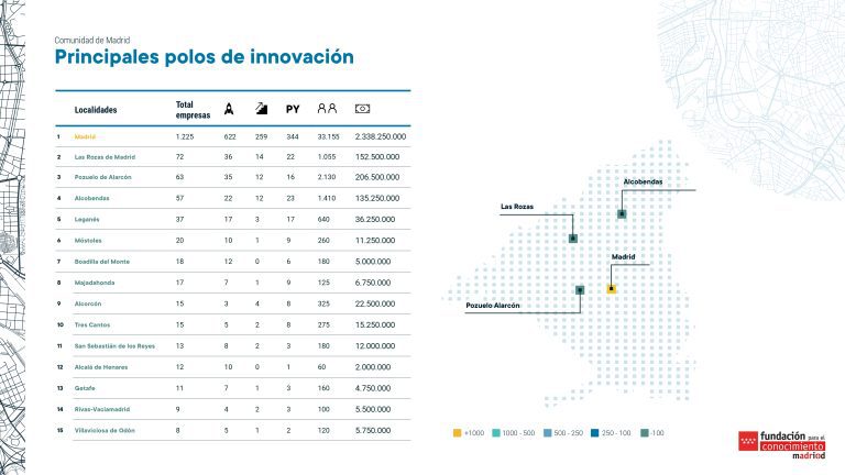El informe, que puede descargarse completo, posiciona a la Comunidad de Madrid en segunda posición por número de empresas tecnológicas, destacando especialmente la ciudad de Madrid, y sitúa por detrás de la capital a Las Rozas, Pozuelo de Alarcón y Alcobendas como los principales hubs de innovación de la región.