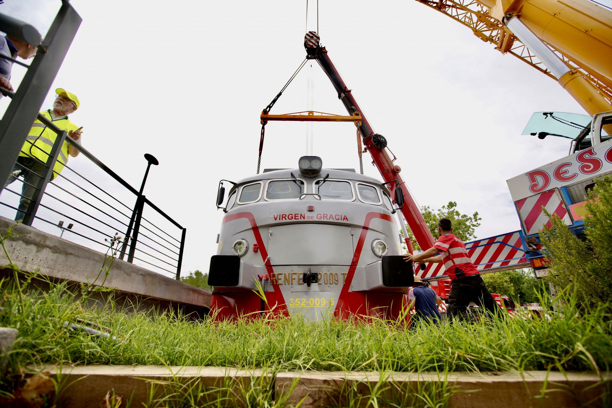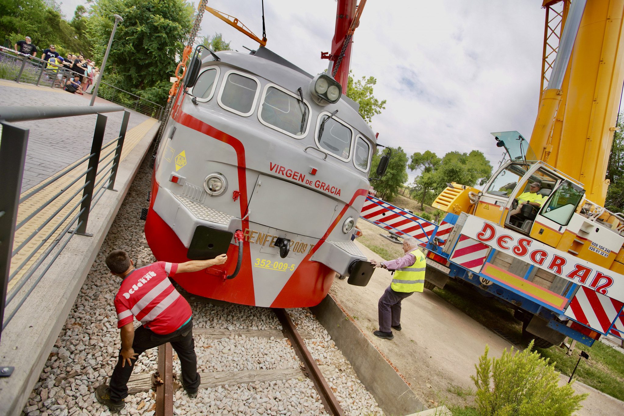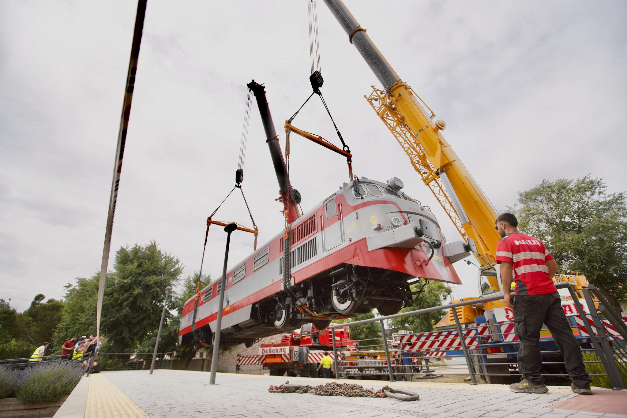 La nueva locomotora y el vagón restaurados llegan a su nuevo emplazamiento en el Barrio de Renfe de Las Matas