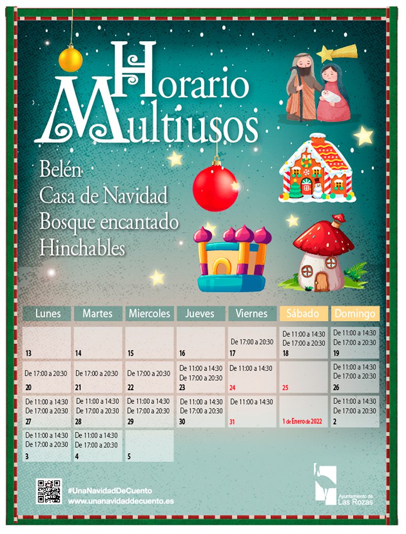 El Centro Multiusos de Las Rozas, ubicado en la avenida del Polideportivo, 22, acogerá a partir de esta tarde actividades de ocio dirigidas a las familias. Quienes lo visiten encontrarán la Casa de la Navidad, donde los más pequeños disfrutarán de una visita guiada por sus estancias, en las que se respira el auténtico ambiente navideño. También podrán disfrutar de otro de los belenes de Las Rozas, en este caso el Belén gigante, o quemar energías saltando en los hinchables. Por último, el Centro Multiusos también será la sede de un completo programa de talleres infantiles.