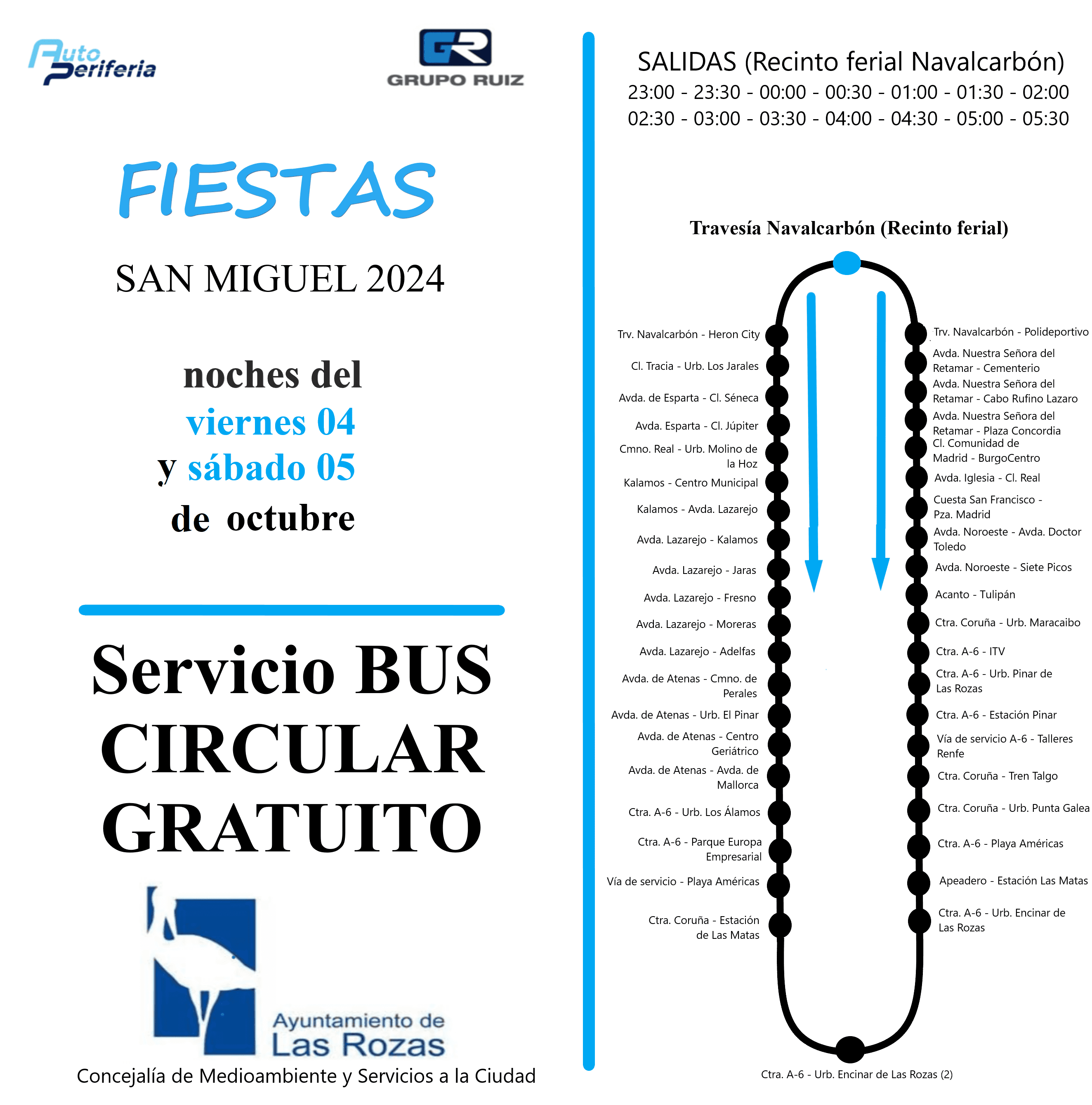 Con motivo de las Fiestas de San Miguel 2024 y para mejorar la movilidad y seguridad de los vecinos, el Ayuntamiento de Las Rozas pondrá en marcha un servicio especial de autobuses nocturnos gratuitos durante las dos noches de más afluencia de personas. Contará con expediciones cada 30 minutos en cada uno de los sentidos desde las 23 horas hasta las 5:30 horas de la madrugada del viernes 4 y del sábado 5 de octubre, realizando un recorrido circular con el fin de ofrecer la mejor cobertura posible a las diferentes zonas y barrios del municipio.