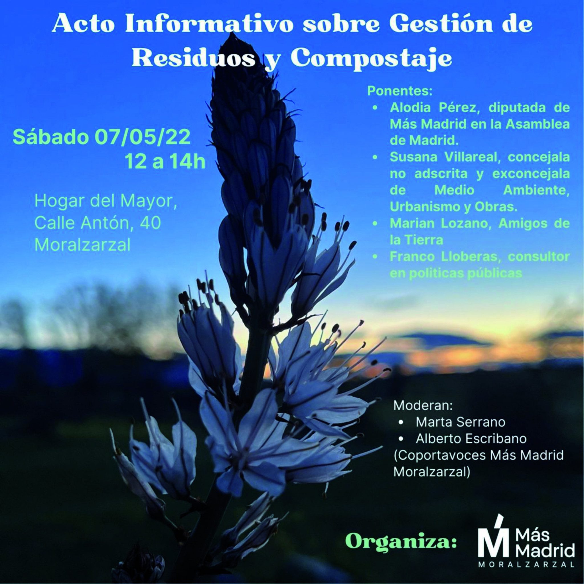 Mañana, sábado 7 de mayo, tendrá lugar el primer acto de la recién validada asamblea de Más Madrid en Moralzarzal. Se trata de un acto informativo sobre gestión de residuos y compostaje que estará dirigido por Marta Serrano y Alberto Escribano, coportavoces de esta formación en el municipio.