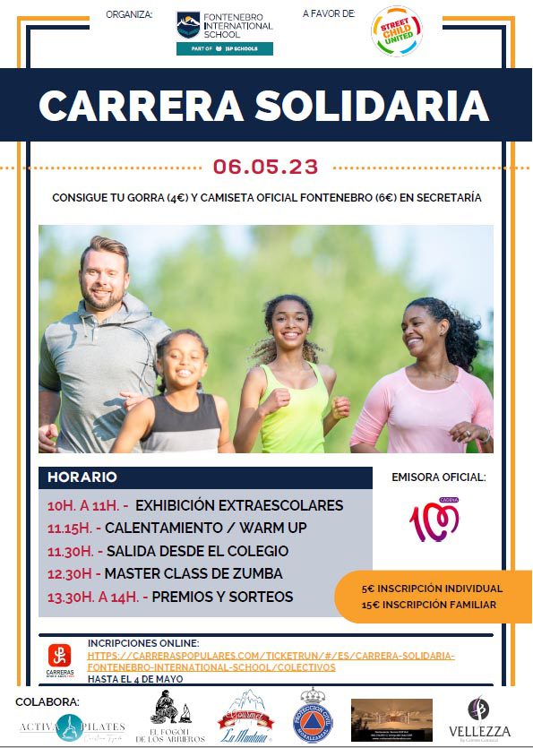 El próximo día 6 de mayo a las 11.15h en Moralzarzal se celebrará la VIII CARRERA SOLIDARIA FONTENEBRO INTERNATIONAL SCHOOL. Esta Carrera, a la que habitualmente se inscriben más de 300 participantes, se organiza todos los años con la organización internacional sin ánimo de lucro “Street Child United” (SCU), https://www.streetchildunited.org/. Esta organización, a través del deporte, defiende los derechos de cada niño y ayuda a cambiar las percepciones negativas de los niños que viven en la calle, con el objetivo de inspirar para conseguir un futuro más brillante y seguro para los niños de todo el mundo. Toda la recaudación obtenida por las inscripciones a la Carrera será donada a SCU.