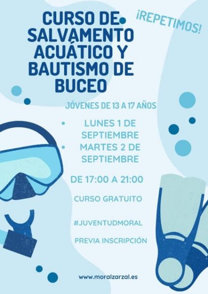 Tras el éxito del pasado curso de salvamento acuático y bautismo de buceo, en septiembre, el Ayuntamiento de Moralzarzal ofrece un nuevo curso gratuito los días 1 y 2 de septiembre. La iniciativa está dirigida a jóvenes entre 13 y 17 años, que podrán aprender salvamento acuático, además de experimentar un bautismo de buceo en la piscina municipal.