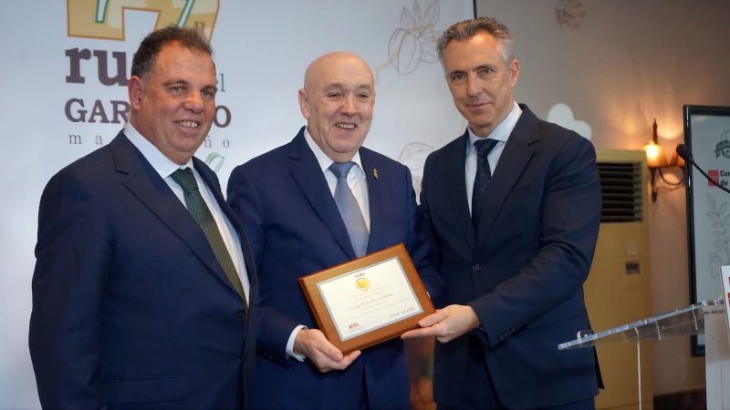 El consejero de Medio Ambiente, Agricultura e Interior de la Comunidad de Madrid, Carlos Novillo, ha clausurado hoy en Brunete la VII edición de la Ruta del Garbanzo, organizada por la cooperativa la Garbancera Madrileña. Además, ha hecho entrega del título Garbanzo dorado a José María Moreno Martín, alcalde de Moralzarzal y exdirector-gerente del Instituto de Investigación y Desarrollo Rural, Agrario y Alimentario (IMIDRA), por su compromiso con la promoción del producto regional.