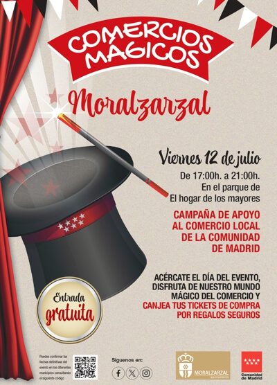 Este viernes, 12 de julio, de 17:00 a 21:00 horas, se celebrará en Moralzarzal, en el parque de El Hogar de Mayores Comercios Mágicos, actividad organizada por la Comunidad de Madrid con el fin de dinamizar los negocios locales.