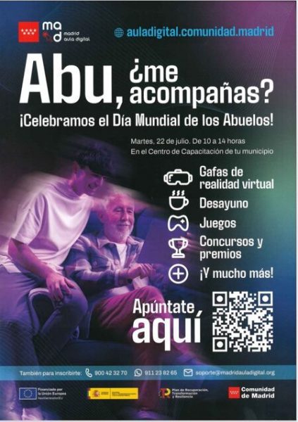 La Comunidad de Madrid ha organizado un evento especial para celebrar el Día Mundial de los Abuelos el martes 22 de julio, de 10.00 a 14.00 horas, en un evento titulado “¿Abu, me acompañas?”, que tendrá lugar en el Centro de Capacitación Digital de Moralzarzal. Los asistentes podrán participar en varias actividades que incluyen gafas de realidad virtual, desayuno, juegos, concursos con premios, entre otras.