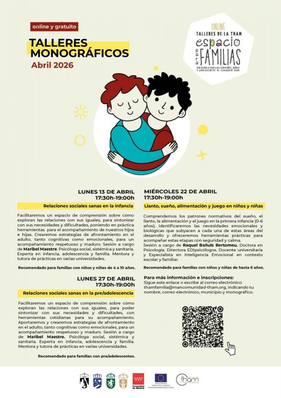 La Mancomunidad THAM (Torrelodones, Hoyo de Manzanares, Alpedrete y Moralzarzal) presenta nuevas sesiones de la iniciativa Espacio para Familias que se desarrollarán a lo largo del mes de abril de forma gratuita en torno a temas de interés relacionados con la educación de la infancia, la adolescencia y la convivencia familiar. «Con ellas queremos mantener activo, un espacio de aprendizaje, encuentro e intercambio de experiencias y buenas prácticas, en el que contamos, además, con la participación de profesionales expertos que nos ofrecen técnicas y estrategias para facilitar la tarea educativa de las familias que participan», señalan los organizadores.