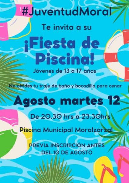 El próximo martes, 12 de agosto, es el Día internacional de la Juventud y el Ayuntamiento de Moralzarzal volverá a celebrarlo con una fiesta nocturna en piscina municipal. Podrán participar aquellos jóvenes con edades entre 13 a 17 años, de 20.30 a 23.30h.