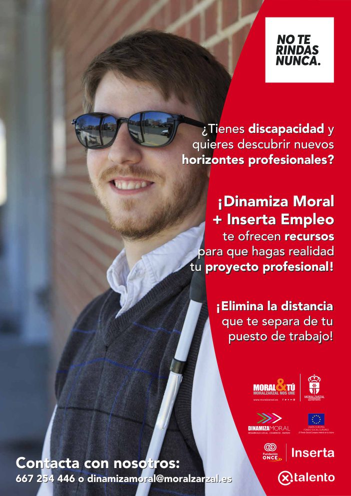 «¿Tienes discapacidad y quieres descubrir nuevos horizontes profesionales? ¡Dinamiza Moral + INSERTA Empleo, te ofrecen recursos y servicios para que hagas realidad tu proyecto profesional! ¡No te rindas nunca! ¡Elimina la distancia que te separa de tu puesto de trabajo!», señalan fuentes municipales.