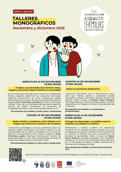 La Mancomunidad THAM (Torrelodones, Hoyo de Manzanares, Alpedrete y Moralzarzal) organiza nuevas sesiones formativas, gratuitas y online, dirigidas a familias con niños y adolescentes dentro del programa Espacio para Familias, cuyo objetivo es mantener un lugar de aprendizaje, encuentro e intercambio de experiencias y buenas prácticas, en el que profesionales expertos puedan ofrecer técnicas y estrategias que faciliten la tarea educativa.