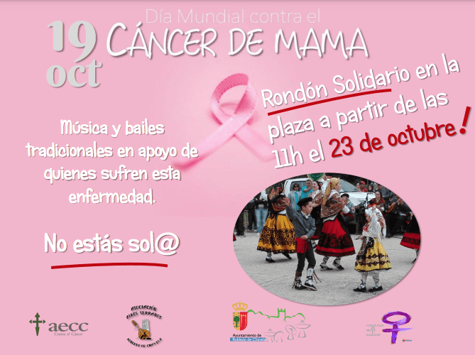 Y el sábado 23 de octubre se llevará a cabo el Rondón Solidario a partir de las 11:00 y hasta las 14:00 en la plaza del Ayuntamiento, con música y bailes en apoyo de quienes sufren esta enfermedad. Para recaudar fondos se ha programado la venta de merchandising (camisetas) y lotería de la AECC.