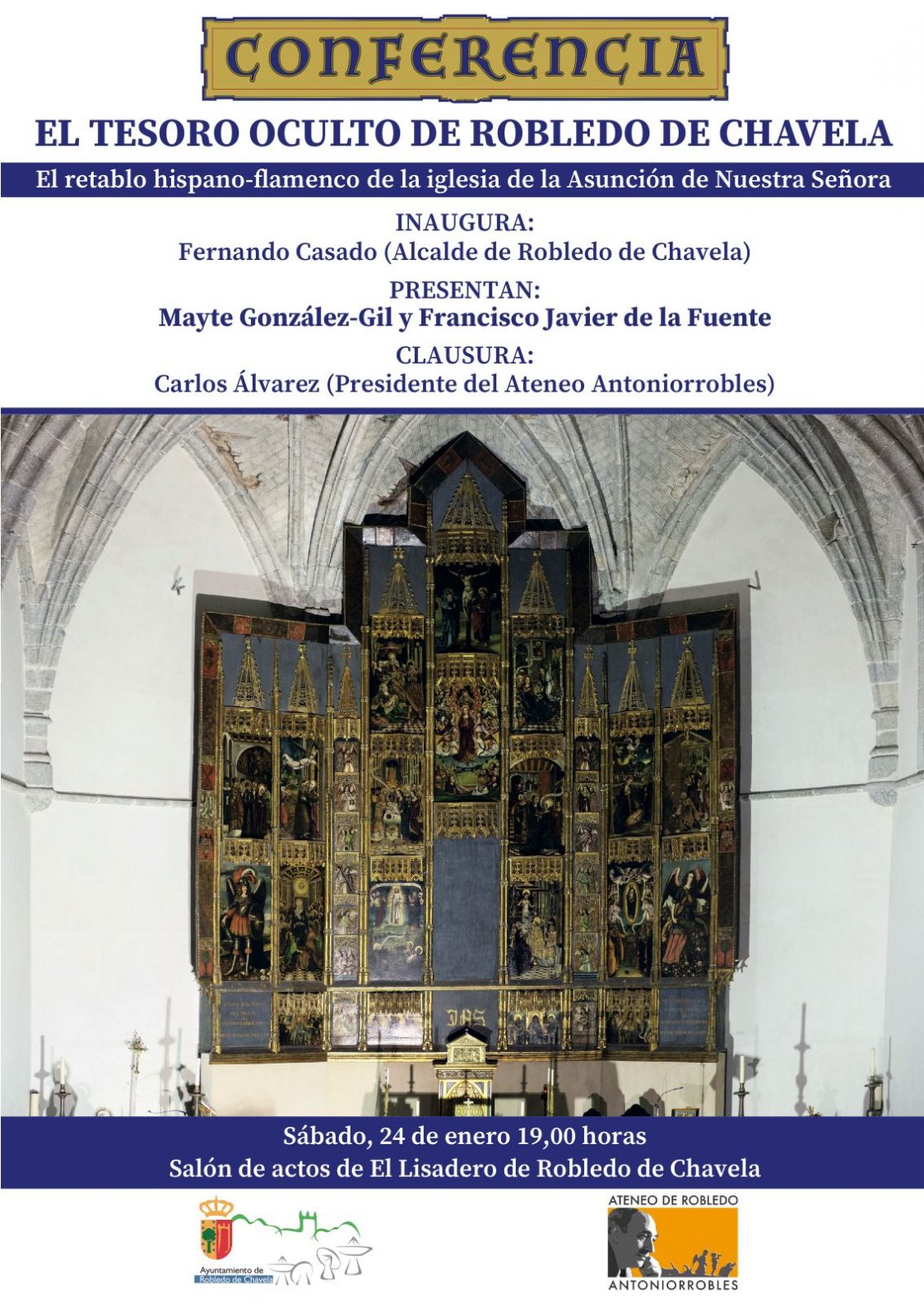 “El tesoro oculto de Robledo de Chavela” es el título de la conferencia que tendrá lugar este sábado, 25 de enero, a las 19 horas en el salón de actos de El Lisadero. La charla correrá a cargo de la periodista y socióloga Mayte González-Gil y del escritor Francisco Javier de la Fuente, mientras que de su presentación y clausura se encargarán el alcalde de Robledo, Fernando Casado, y el presidente del Ateneo Antoniorrobles, Carlos Álvarez, respectivamente.