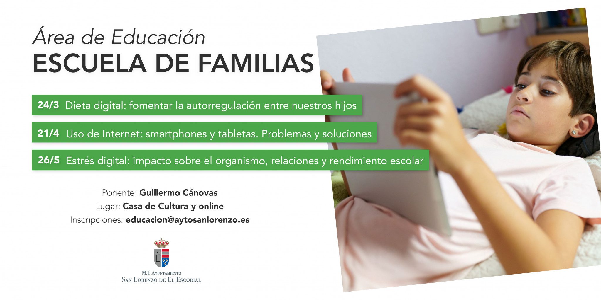 El área de Educación de San Lorenzo de El Escorial ha programado tres nuevas sesiones dentro del programa formativo “Escuela de familias”, dedicadas al uso que los hijos hacen de Internet y cómo afrontar los problemas que pueden surgir del mismo. La primera de las sesiones se celebrará el 24 de marzo y bajo el título “Dieta digital: fomentar la autorregulación entre nuestros hijos como forma de afrontar el uso patológico” abordará cómo identificar si una conducta puede empezar a ser adictiva, cómo influyen las emociones en el uso de las redes sociales y qué factores podemos observar en nuestros hijos.