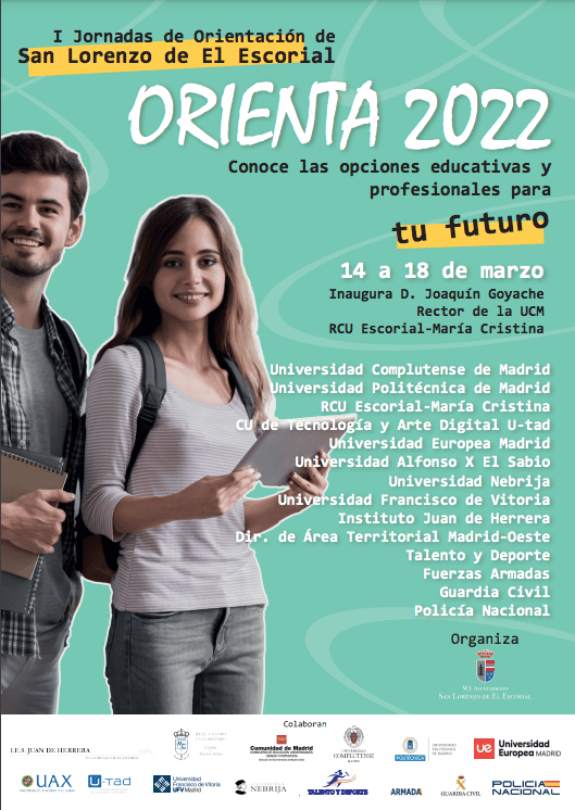 Del 14 al 18 de marzo, San Lorenzo de el Escorial celebra “Orienta 2022”, sus primeras jornadas de mentoring dirigidas a los estudiantes del municipio que finalizan sus estudios de Bachillerato o se encuentran en el último curso de la Educación Secundaria Obligatoria, con el objetivo de que conozcan las posibilidades que se les ofrece a nivel de formación o salidas profesionales.