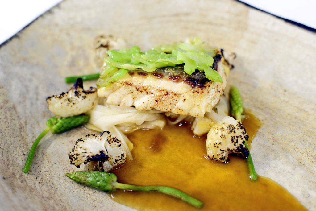 «La dorada de Estero queríamos respetarla totalmente. Hecha a la plancha con un caldo ahumado con mejillones. Los últimos espárragos de la temporada y para finalizar con la casquería vegetal: el tronco del brócoli infusionado con hierbas del Monte Abantos».