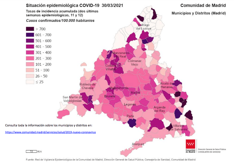 Galapagar.- El informe de este martes 30 de marzo registra un descenso en la incidencia de Covid-19, pasando de 290,44 a 266,73 casos / 100.000 habitantes. En las últimas dos semanas se han notificado 90 nuevos positivos (8 menos que en el anterior balance).