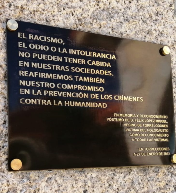 Por su parte, el Partido Socialista de Torrelodones, presente en el acto, ha recordado que un vecino de la localidad, Félix López, estuvo cautivo en el campo de concentración de Buchenwald, de donde fue liberado en abril de 1945 tras trabajar como esclavo del régimen nazi. Desde enero de 2012, una placa en la fachada de la Biblioteca Municipal de la calle Real recuerda la figura de López. En ella se puede leer en la que se puede leer: «El racismo, el odio o la intolerancia no pueden tener cabida en nuestras sociedades. Reafirmemos también nuestro compromiso con la prevención de los crímenes contra la Humanidad».