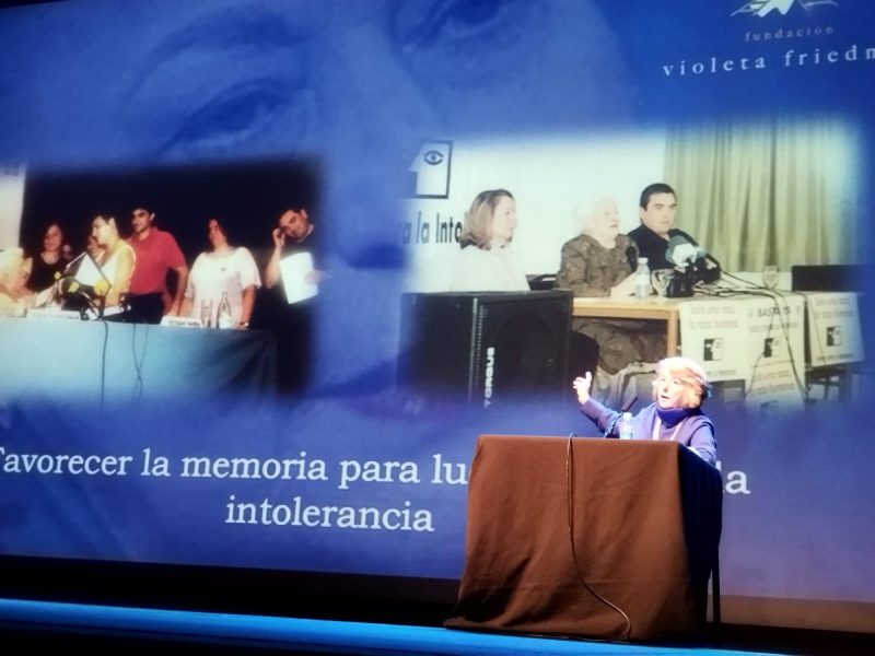 Por su parte, Patricia Weisz, hija de Violeta Friedman y presidenta de la fundación que lleva su nombre, relató la vida de su madre, sus recuerdos de cuando era niña y de cuando rompió el silencio en 1985 y comenzó entonces una nueva lucha contra el negacionismo del Holocausto. En noviembre de 1991 el Tribunal Constitucional dio la victoria a su madre, lo que supuso una reforma del Código Penal en materia de racismo. Desde ese momento y hasta su fallecimiento en el año 2000, Violeta Friedman, enterrada en el cementerio judío de Hoyo de Manzanares, se convirtió en una activista y pionera de la lucha contra la intolerancia y la xenofobia, que recorrió centros educativos, medios de comunicación y diferentes espacios para que todo lo sucedido no se olvidara.
