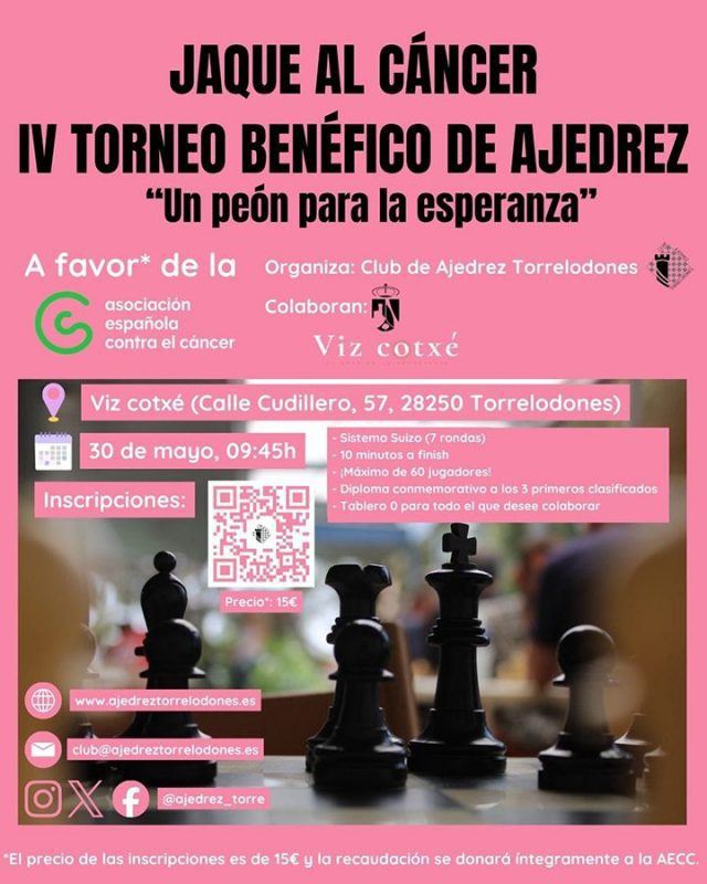El Club Ajedrez Torrelodones, en colaboración con el Ayuntamiento, organiza el IV Torneo benéfico de ajedrez, a beneficio de la Asociación Española Contra el Cáncer. El evento, abierto a la participación de jugadores de todas las edades y niveles, se celebrará el 30 de mayo, a partir de las 9:45, en la cafetería Viz cotxé (calle Cudillero,57) con el eslogan “Un peón para la esperanza”. La recaudación íntegra de las inscripciones y el tablero 0 se destinará a la AECC.