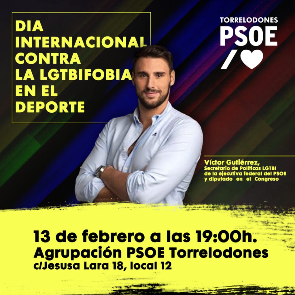 Para celebrar el Día Internacional contra la LGTBifobia en el deporte, que se conmemora el 19 de febrero, el Partido Socialista de Torrelodones, ha organizado una charla con el secretario de Políticas LGTBi del PSOE y diputado en el Congreso por Madrid, Víctor Gutiérrez, sobre el repunte de la homofobia en el mundo del deporte y del incremento de la intolerancia contra el colectivo LGTBi.