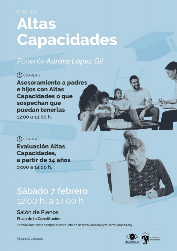 La Concejalía de Desarrollo Local del Ayuntamiento impulsa este mes de febrero una sesión formativa sobre altas capacidades de la mano de Aurora López Gil, doctora en «De frente a la superdotación». El ciclo tendrá lugar durante la mañana del sábado 7 de febrero y se dividirá en dos charlas. La primera, «Asesoramiento a padres e hijos con Altas Capacidades o que sospechan que puedan tenerlas», será de 12:00 a 13:00 h, mientras que la segunda, «Evaluación Altas Capacidades, a partir de 14 años», se desarrollará de 13:00 a 14:00 h.