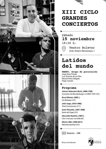 El sábado 15 de noviembre, el Teatro Bulevar acogerá el concierto “Latidos del mundo”, a cargo del prestigioso Grupo de percusión TEMPO. El espectáculo propone un recorrido por los ritmos y sonidos de diferentes épocas y geografías, mostrando la percusión como un lenguaje universal capaz de conectar emociones y tradiciones de todo el planeta.