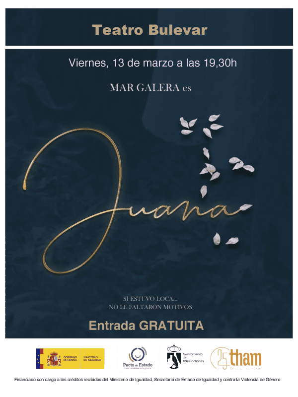 La obra Juana. Si estuvo loca… no le faltaron motivos podrá verse el viernes 13 de marzo a partir de las 19:30 h en el Teatro Bulevar. Mar Galera dará vida a Juana I de Castilla en una revisión histórica convertida en monólogo que explorará la soledad y la lucidez de una mujer silenciada. La entrada será gratuita y libre hasta completar aforo.
